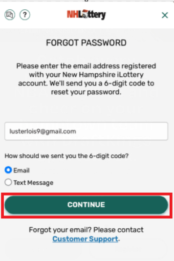 If Email is selected, enter your email address registered with your NH Lottery account.