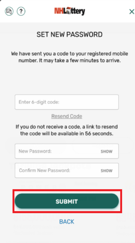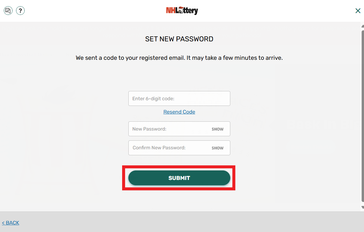 Enter the 6-digit code you received in your registered email or phone number. Then, fill out your new password. Select “SUBMIT.”