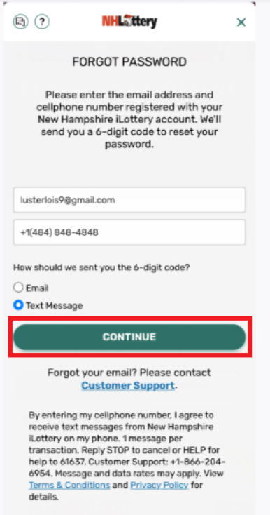 If Text Message is selected, enter your email address and cell phone number registered with your NH Lottery account.