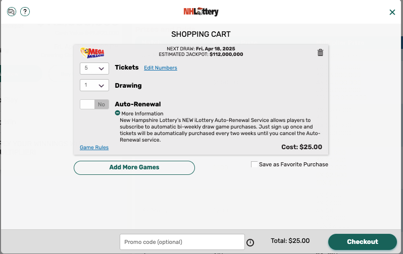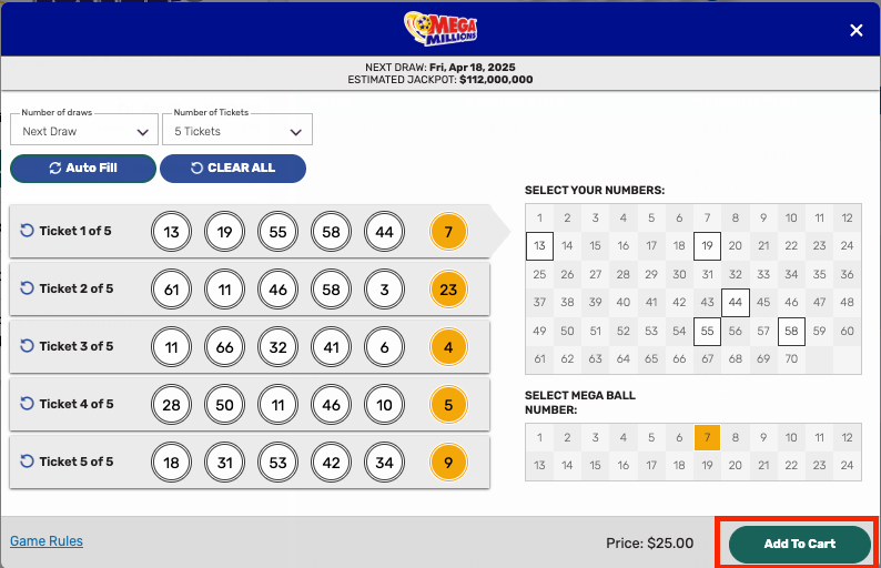 - Depending on the game, you can select an Easy Pick option or choose to manually select your numbers.