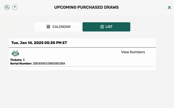 - On the Upcoming Purchased Draws page, you can view your upcoming draw games in either Calendar or List view.