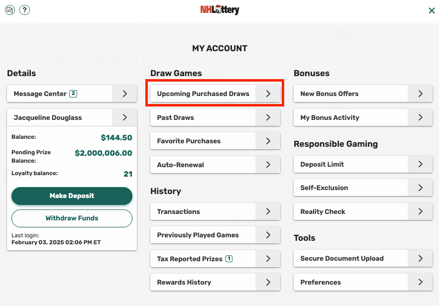 Step 2: Navigate to "Upcoming Purchased Draws"