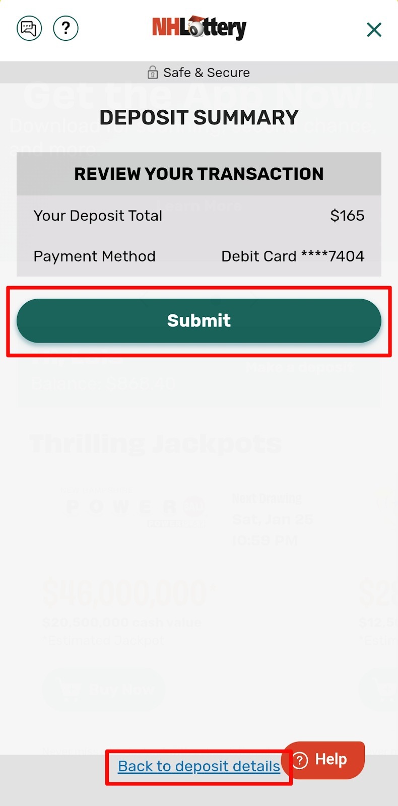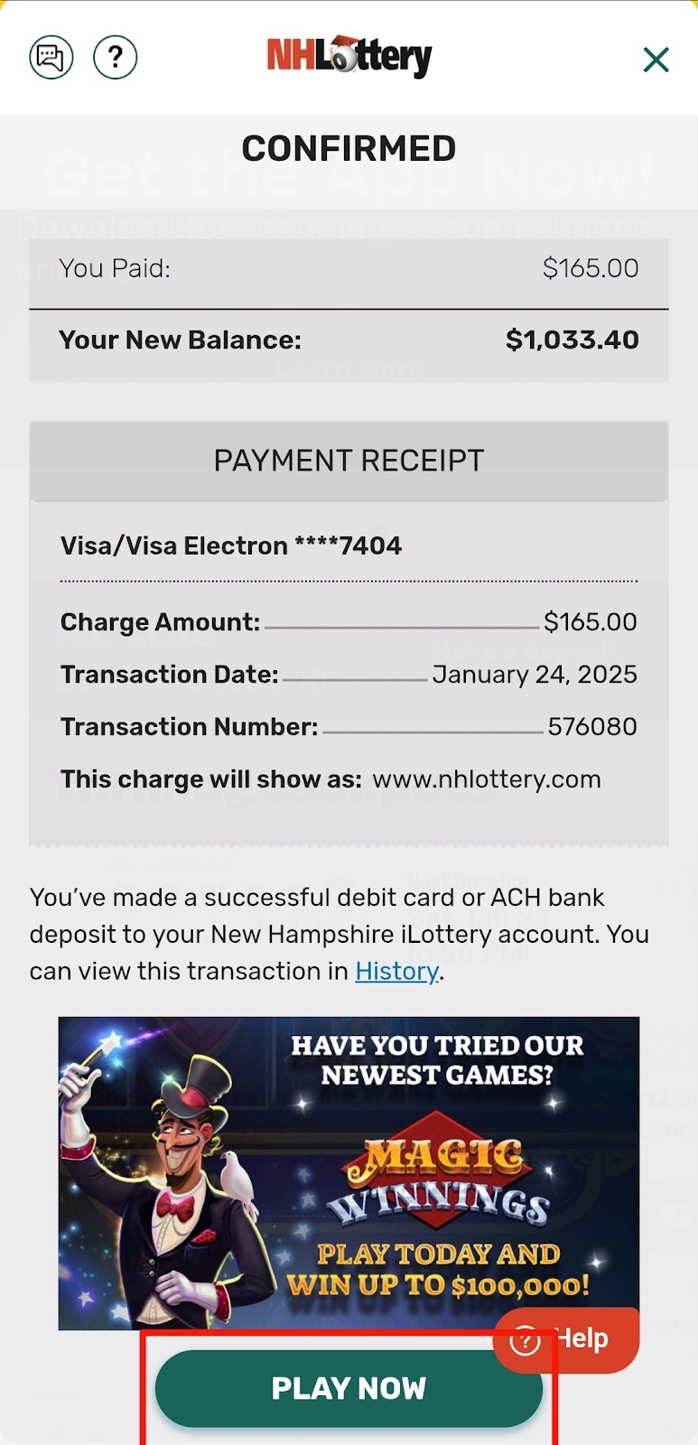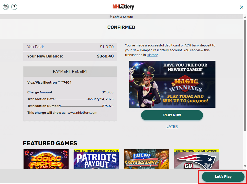 Congratulations! Once you see the confirmation screen, you’ve successfully made a deposit into your iLottery account. You can scroll down and click PLAY NOW or continue down to any of the featured games to start playing now!