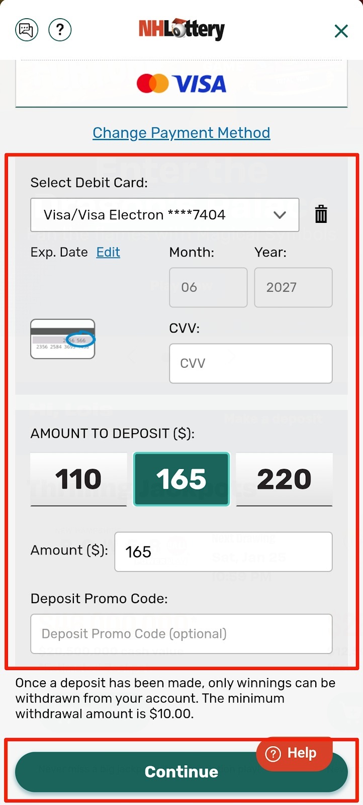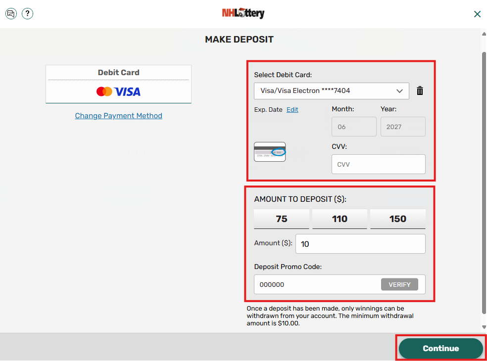 Enter your debit card information. Choose the amount you wish to deposit. When using a Promo Code, make sure it appears in the Deposit Promo Code box. If you type in the Promo Code, please use the VERIFY button to ensure the Promo Code is valid. Click CONTINUE.