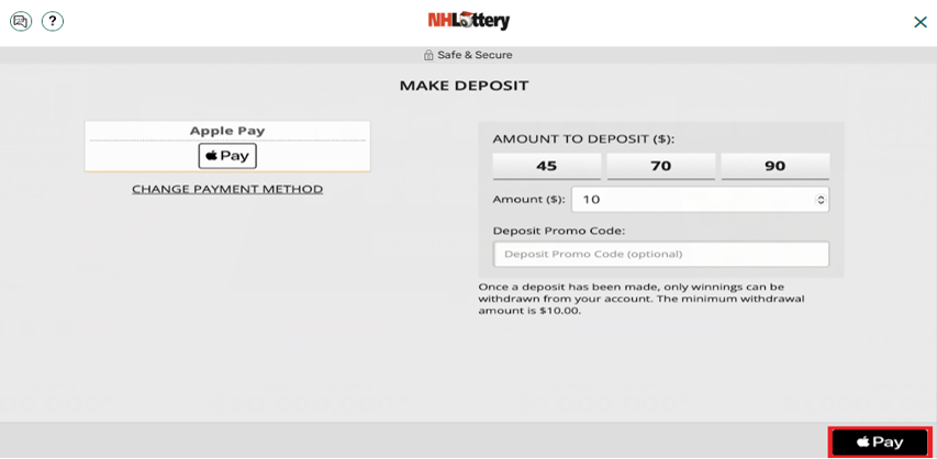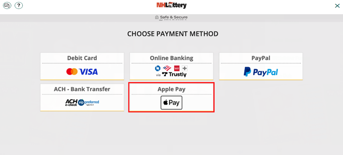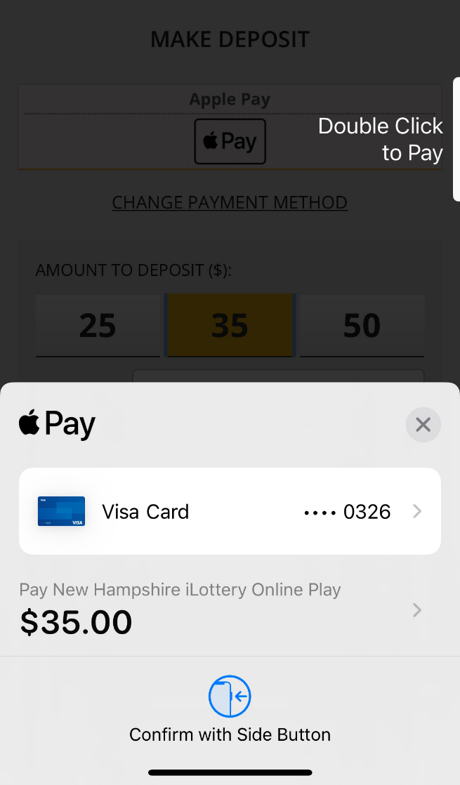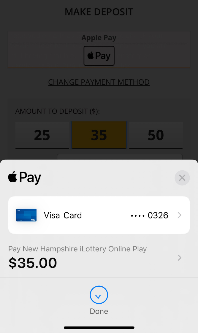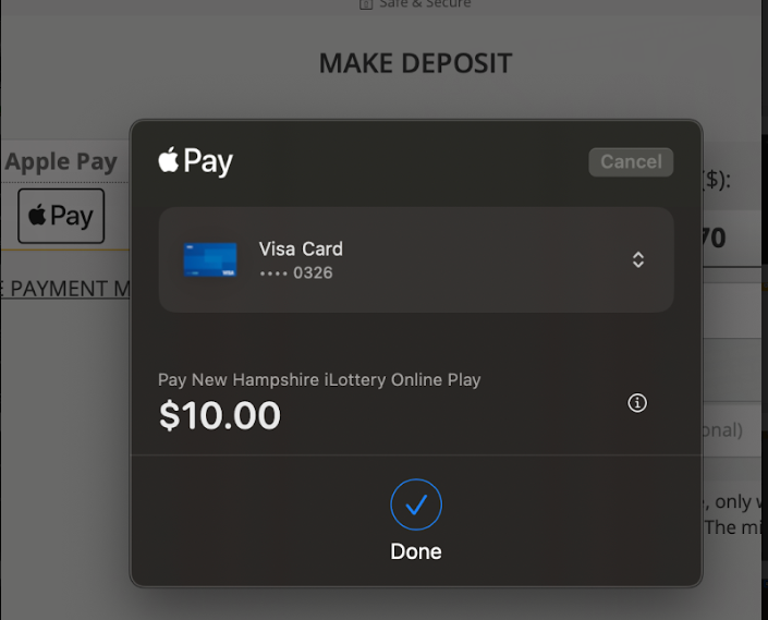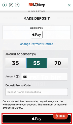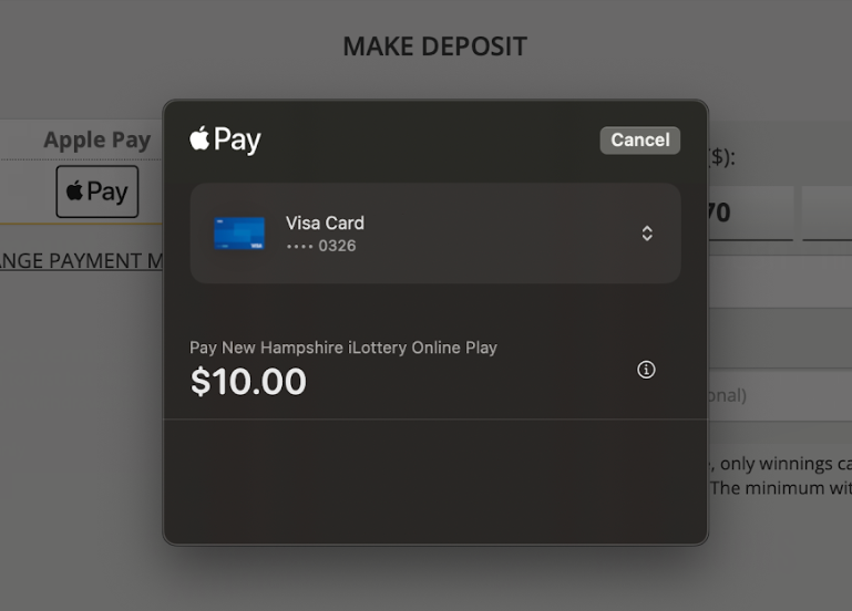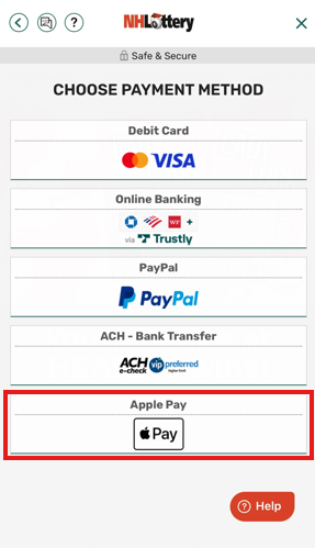 Note: You must have a Debit Card linked to your Apple Wallet to continue. Credit Cards are not a valid payment method for NH iLottery.