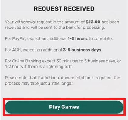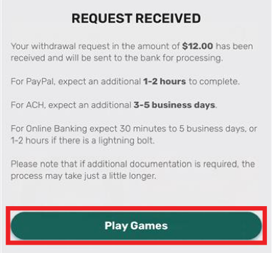Once you see the REQUEST RECEIVED screen, your withdrawal has been submitted. Keep an eye out for an email confirmation, and in the meantime, select “Play Games” to head over to the games lobby for more iLottery fun!