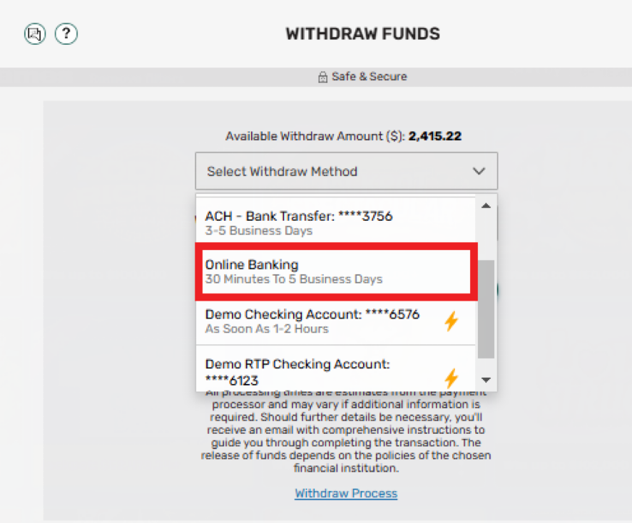 Use the drop-down arrow to select which withdrawal method you would like to use. Please be aware that the first time you choose Online Banking, Venmo, or PayPal, you will be asked to log into the associated account to continue. We will demonstrate with Online Banking.