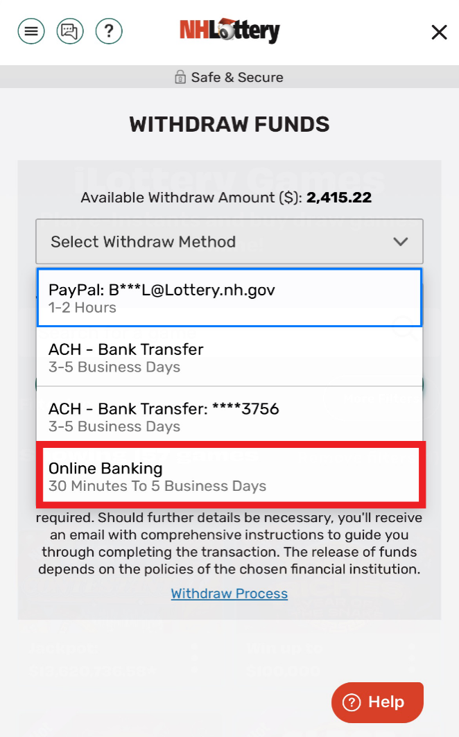 The first time you use a new withdrawal method, a two-factor authentication (2FA) email will be sent to the email associated with your NH Lottery account with a 6-digit code. Go to your email and locate the 6-digit code. Input the code into the field and click “Submit.”